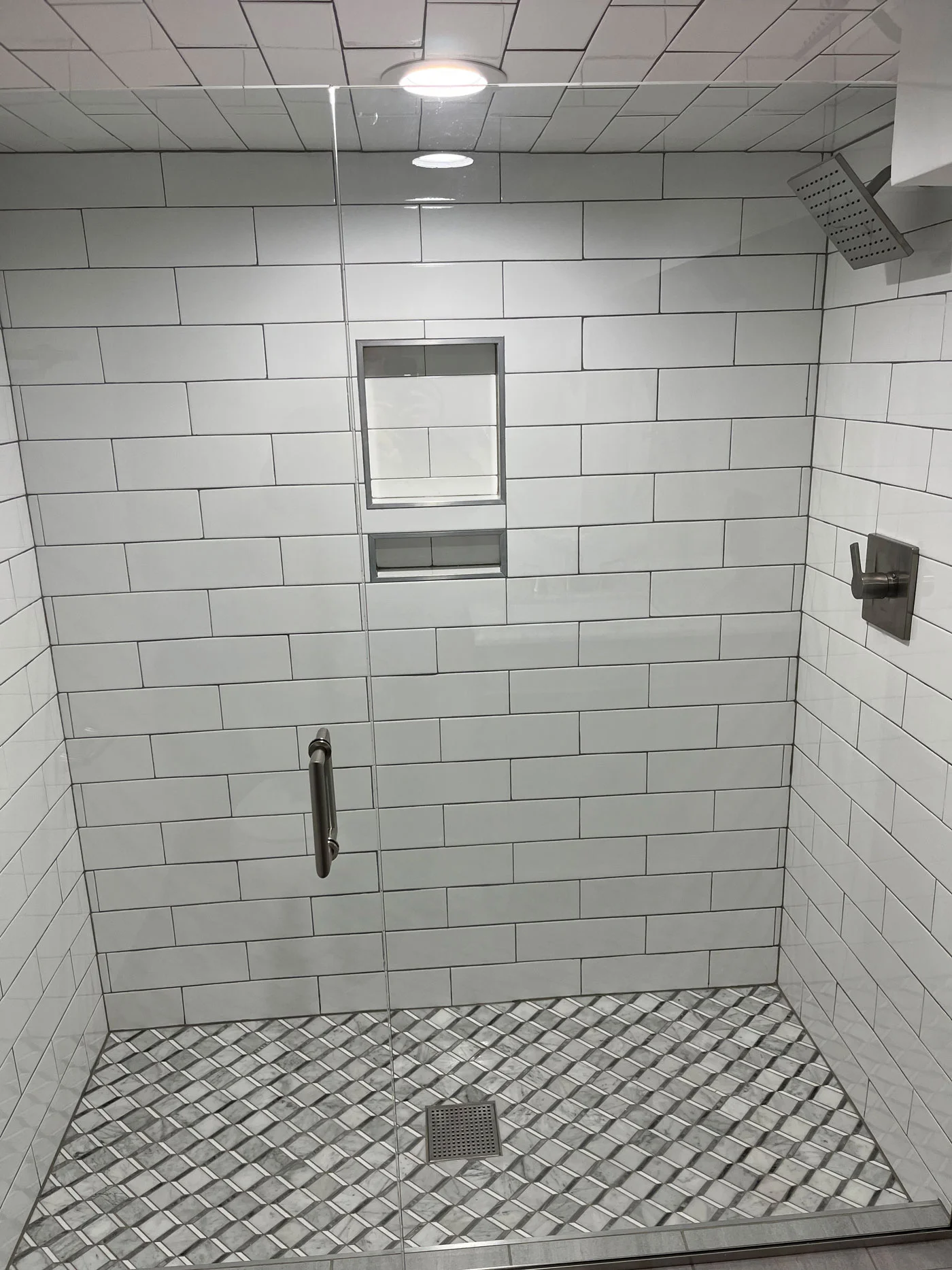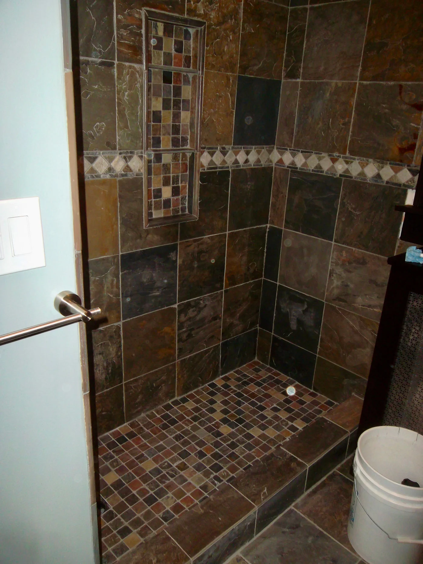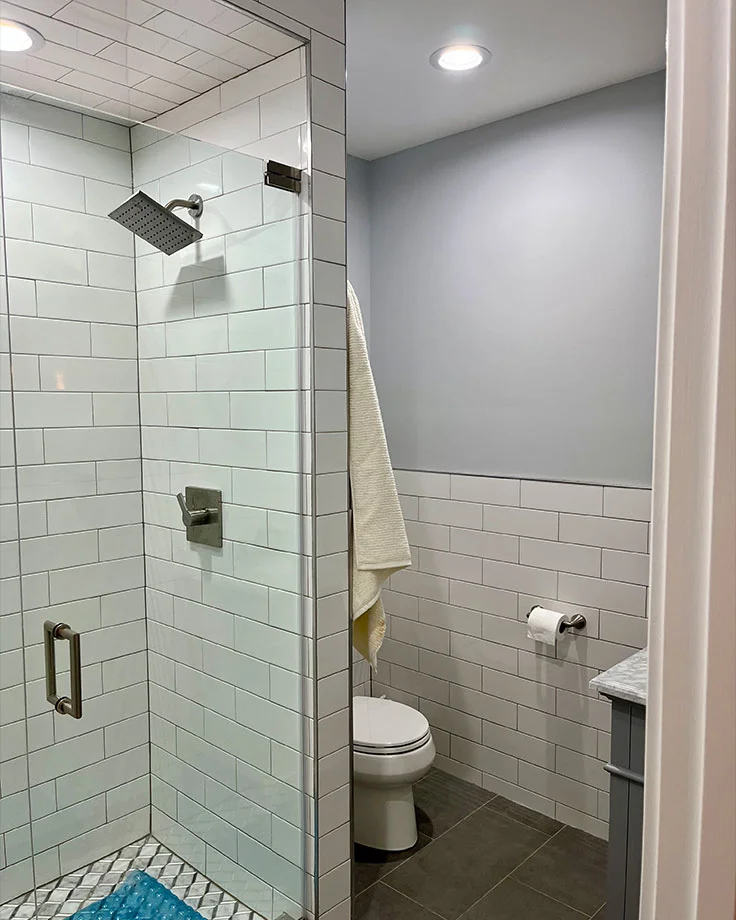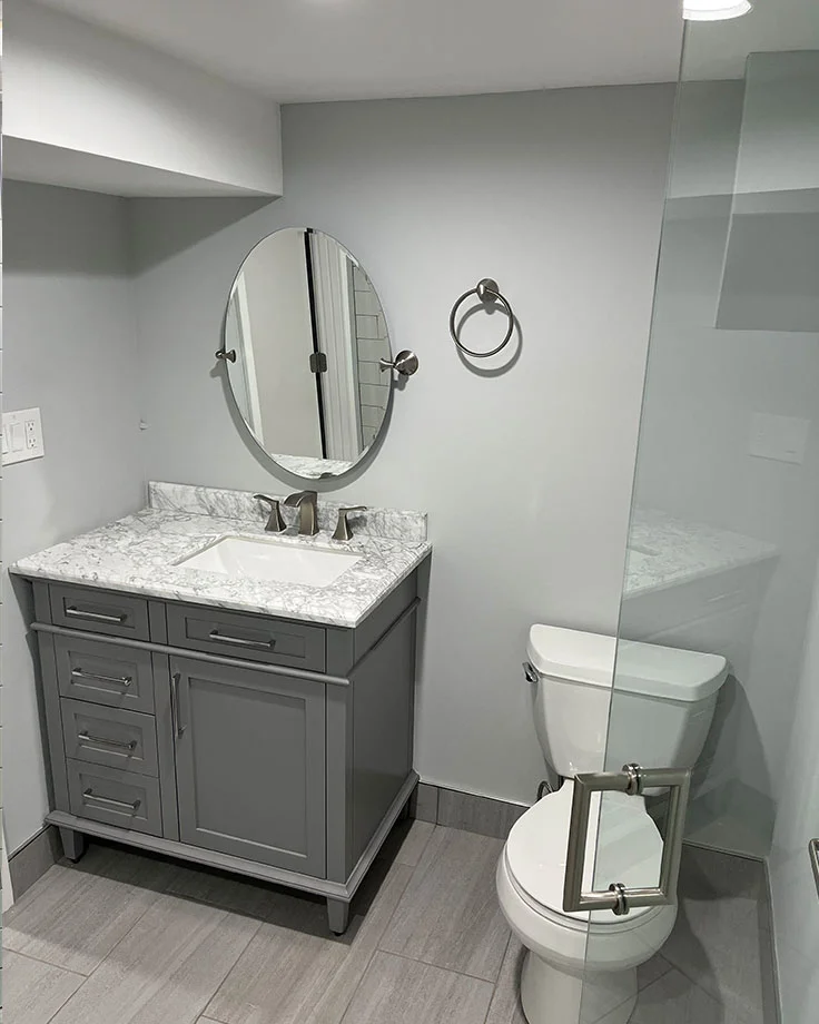 Remove existing bathtub/shower enclosure, tile and wallboard in shower area, shower valve, vanity with top, mirror, lights, toilet, tile and underlayment, baseboard, shoe molding, bathroom accessories and exhaust fan. Install high quality fixtures and materials, paint walls, ceiling, trim and inside of door.